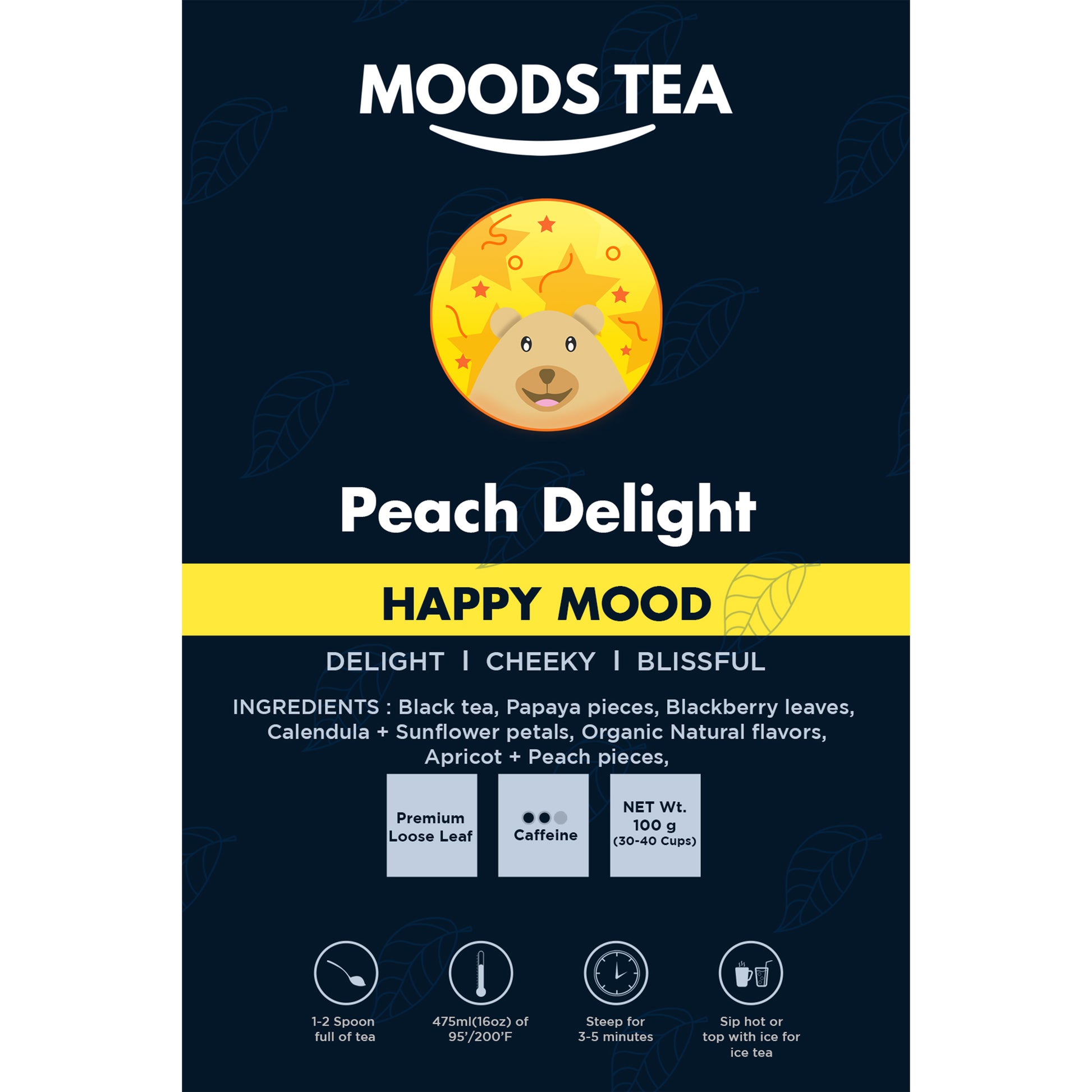 Premium Ingredients: Black tea, Papaya pieces, Blackberry leaves, Apricot + Peach pieces, Calendula + Sunflower petals, Organic Natural flavors